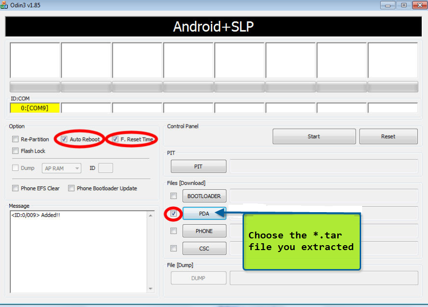 Extract the file you just downloaded once so you end up having a *.tar file. Now make sure Kies is not running. Also make sure its tray icon disappeared as well. After performing those steps start Odin 1.85.